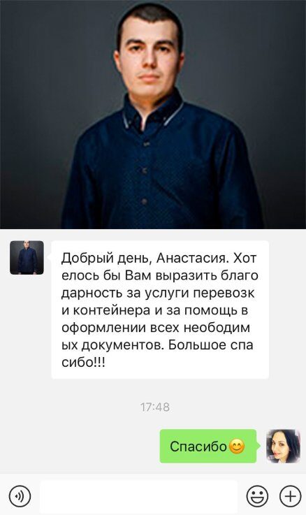 Хотелось бы Вам выразить благодарность за услуги перевозок и контейнера, и за помощь в оформлении всех необходимых документов. Большое спасибо!!!